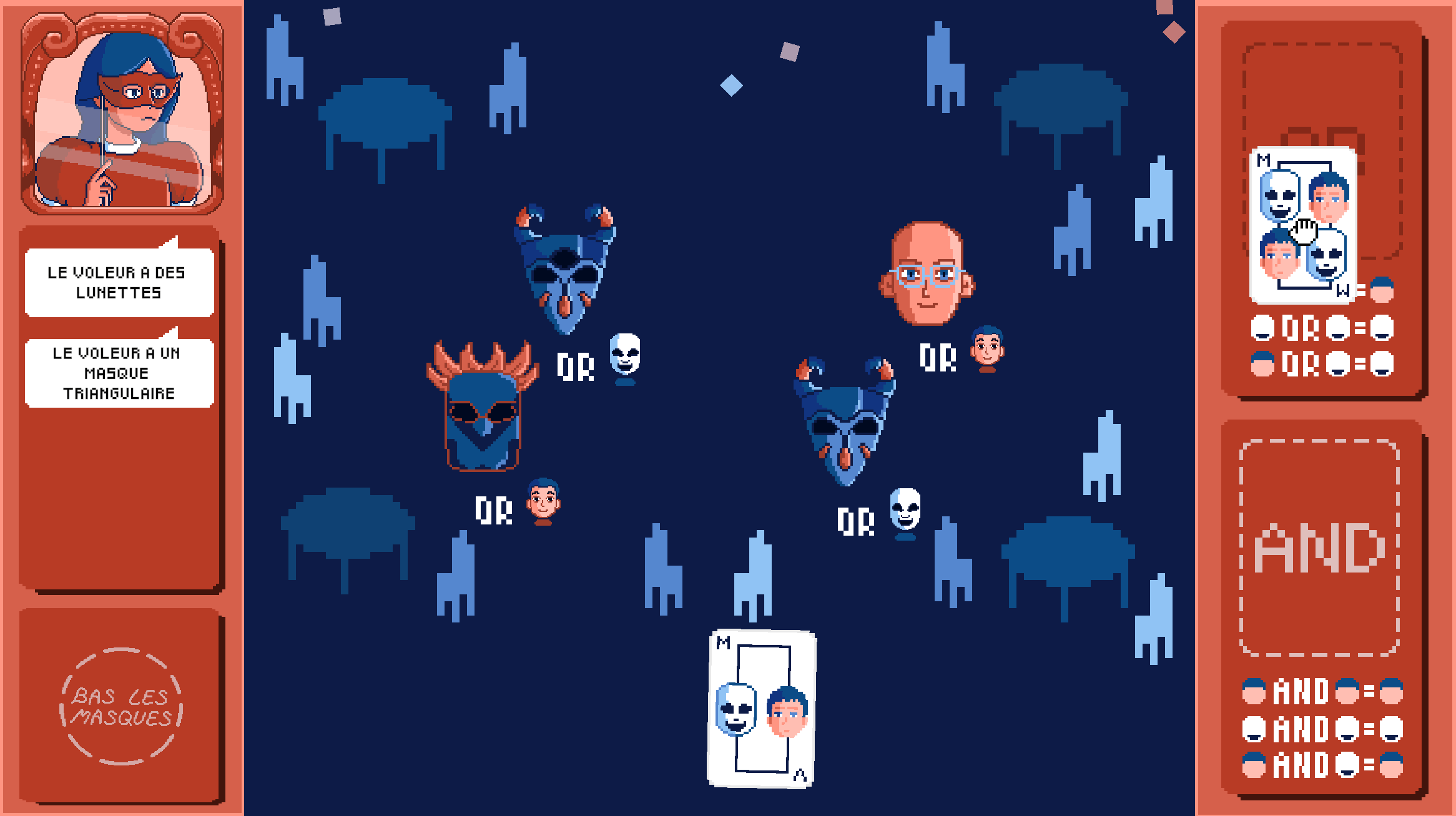 - Utilisez les cartes en votre possession pour prendre connaissance des visages/masques des invités et ainsi identifier le coupable du vol.